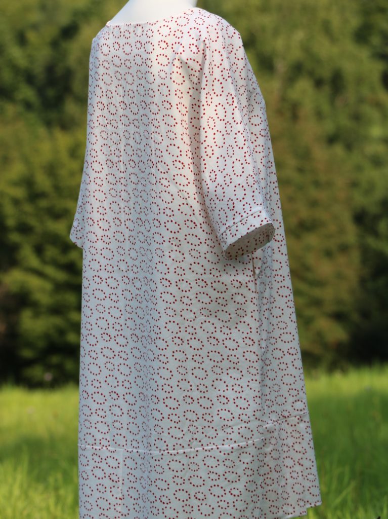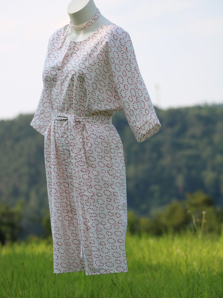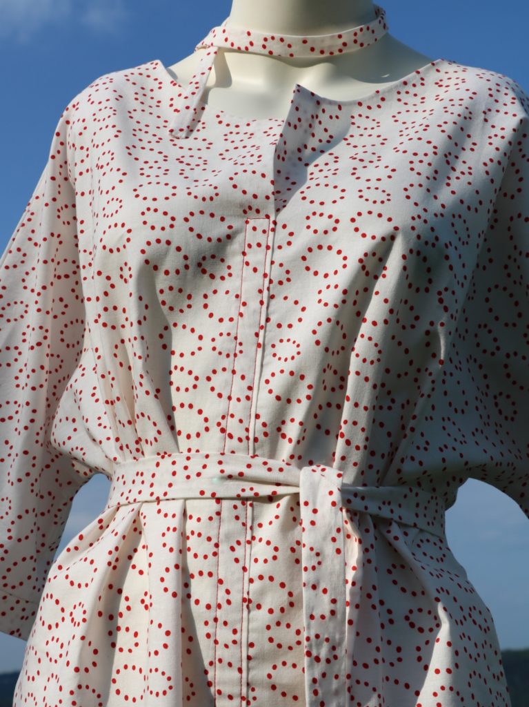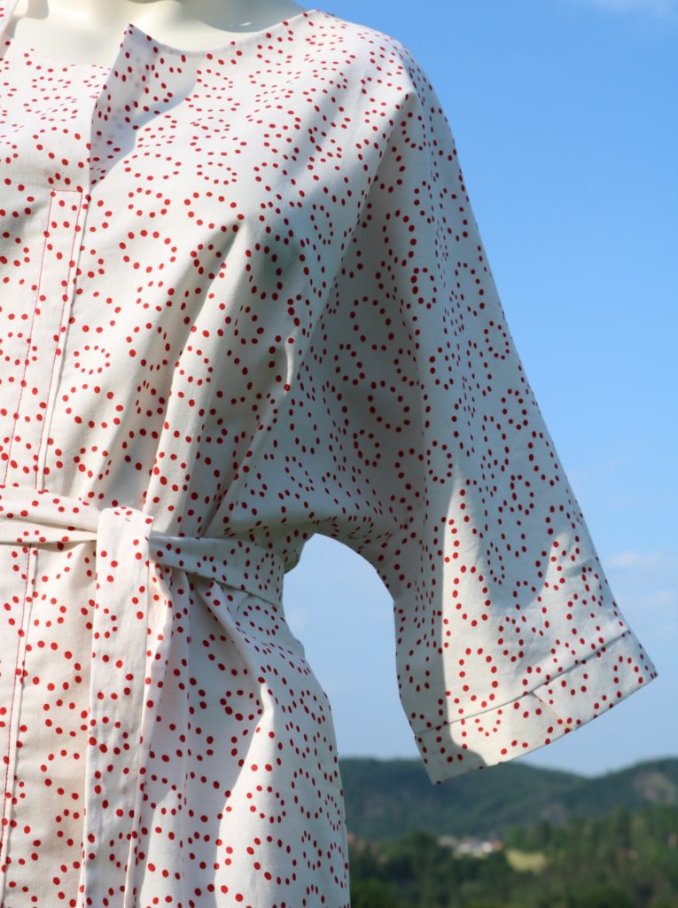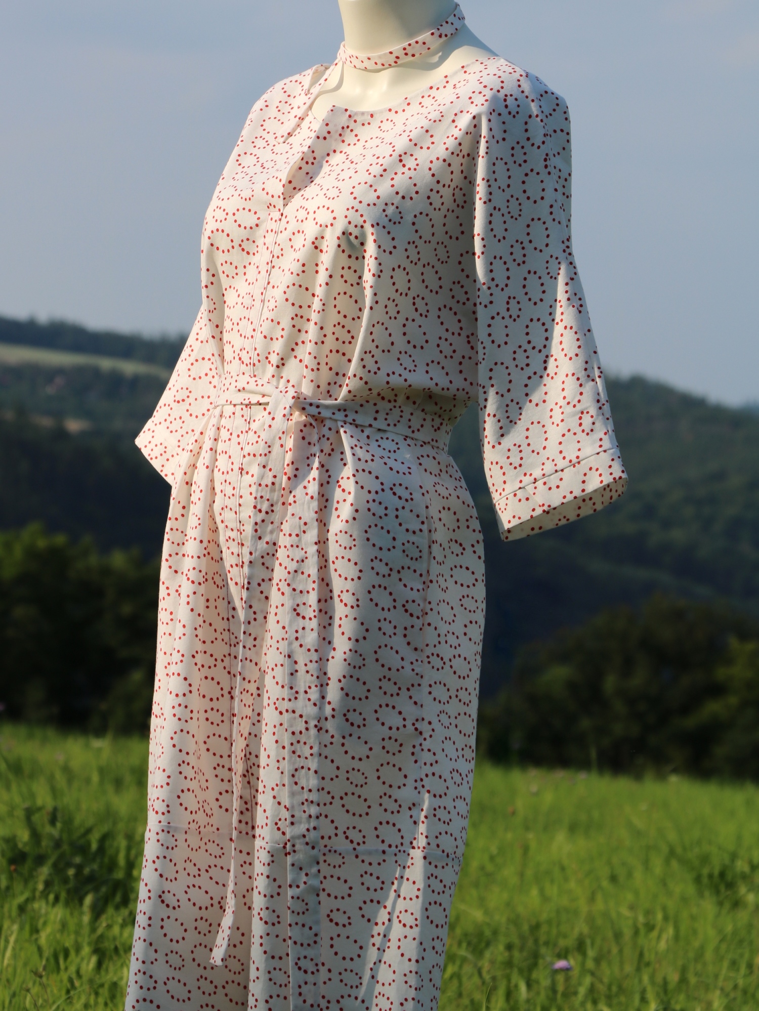 Bílé košilové šaty s červenými puntíky. Doplněné kapsami ve švu, páskem a úzkou stuhou. V přední části léga, u krku otevřená. Ve spodní části kanýr s překrytým rozparkem. Univerzální velikost šatů, která vyhovuje vel. 36-42. Dekolt a spodní délka ručně obšité. Délka 97 cm, délka rukávu od krku 43 cm, obvod šatů v bocích 115 cm. Rozparek na rukávu. 100% bavlna.