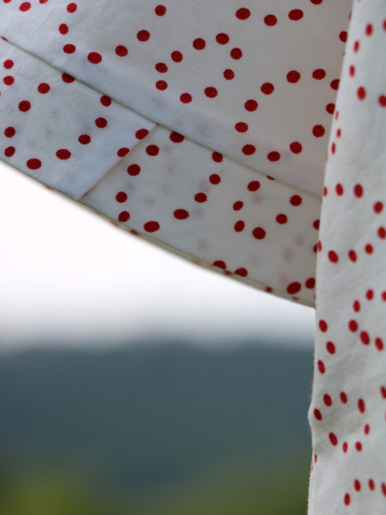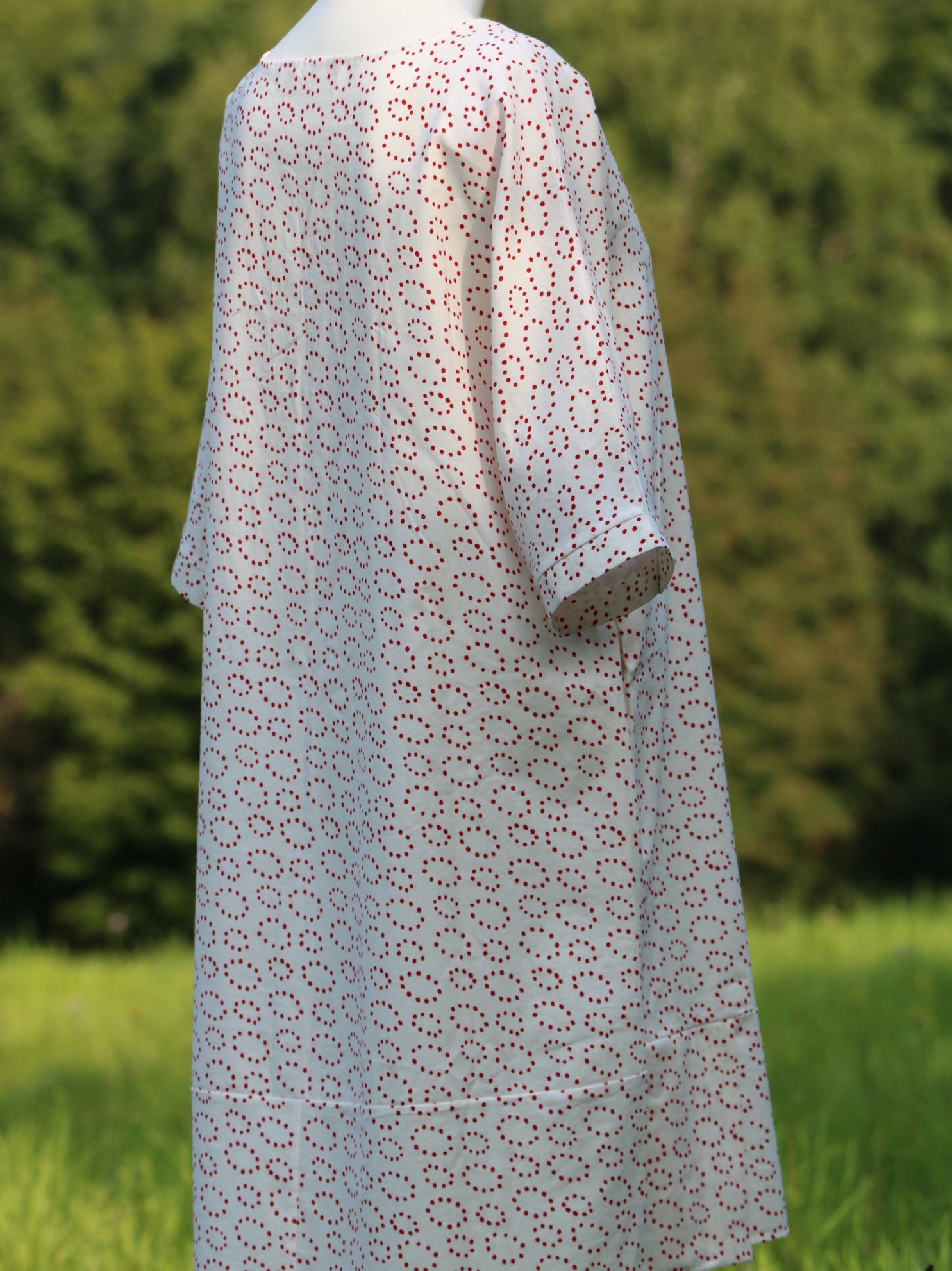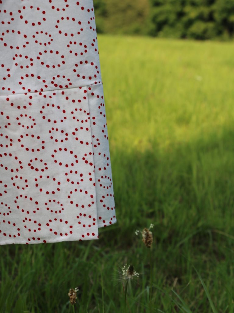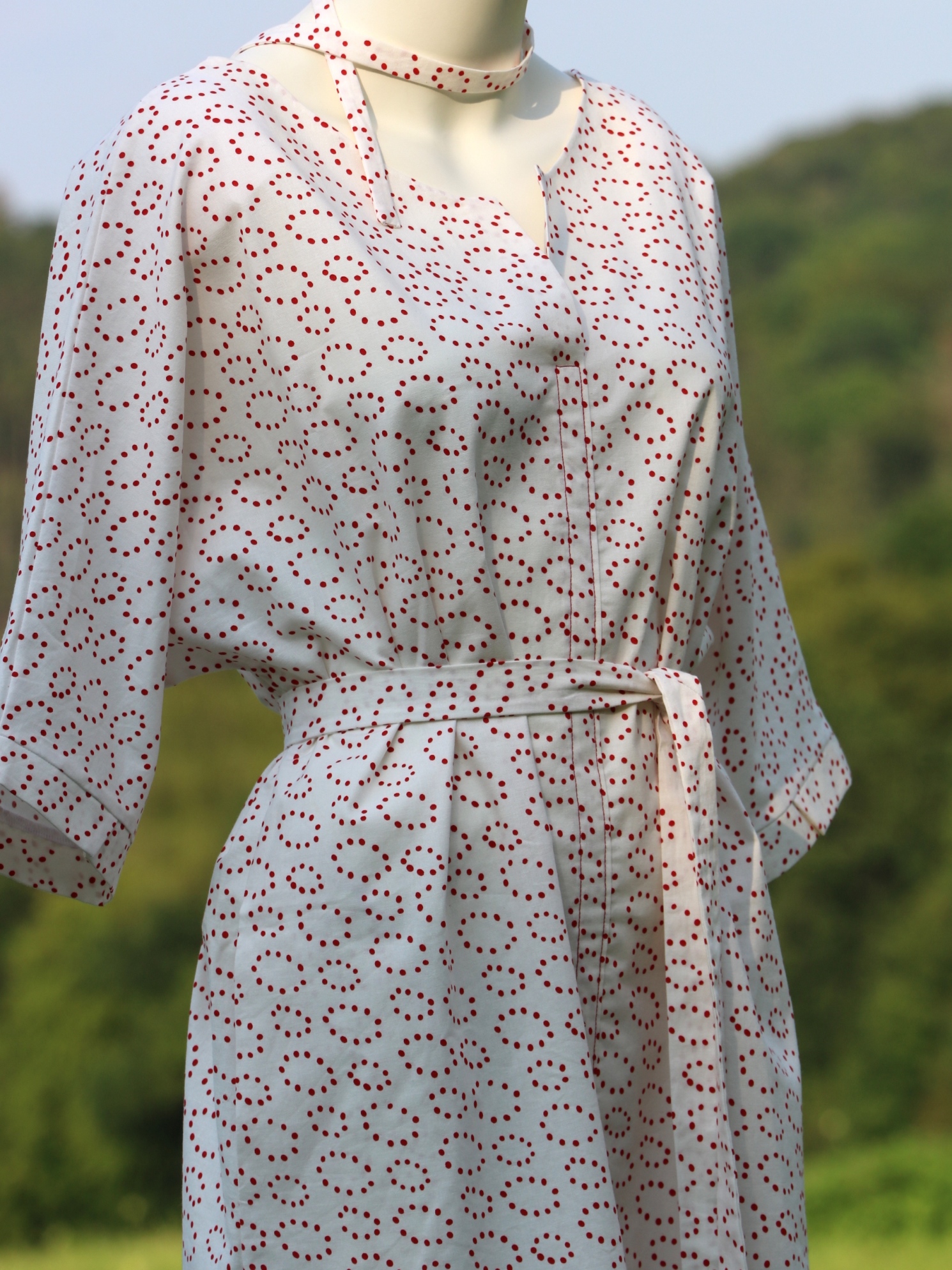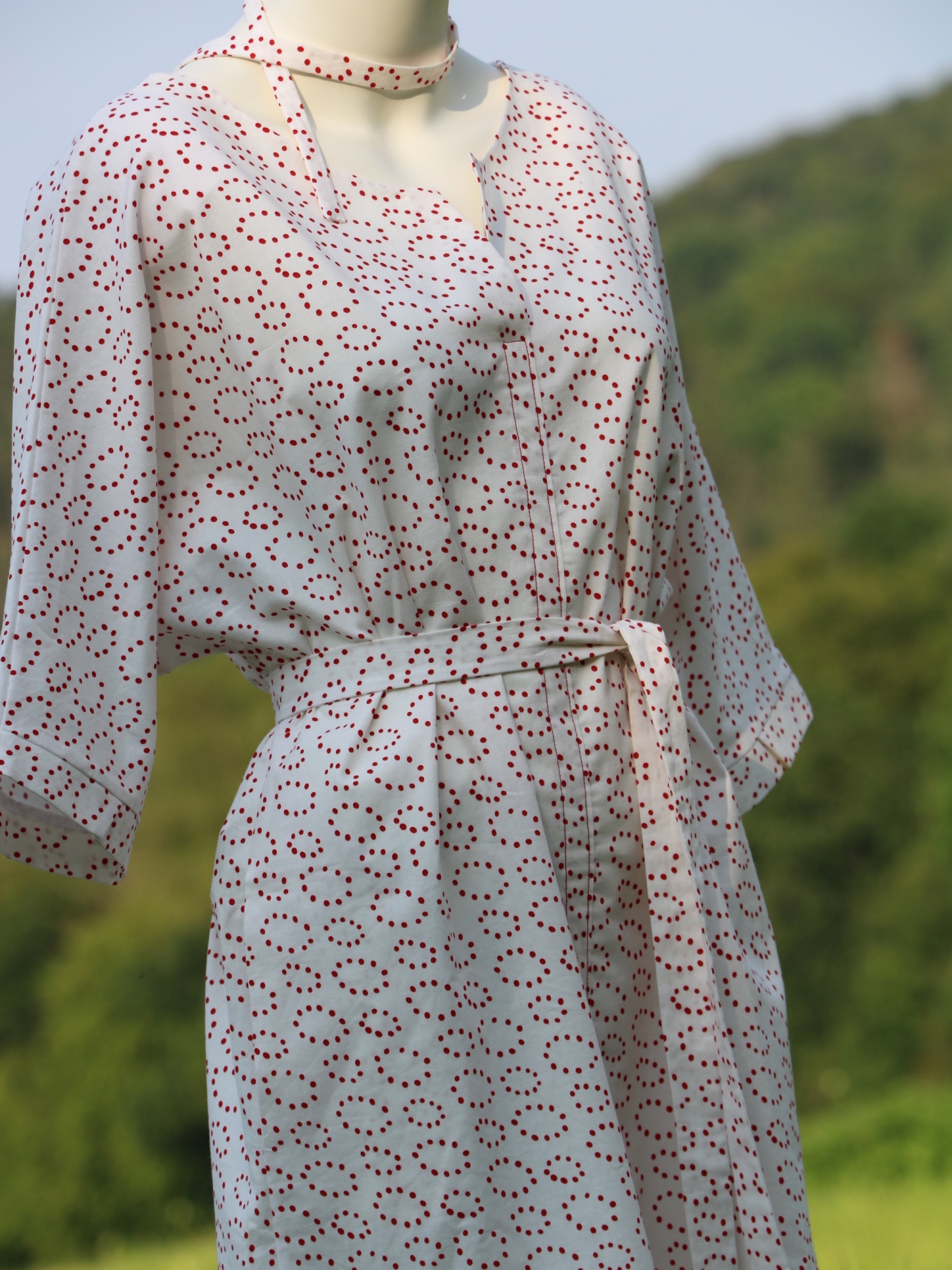 Bílé košilové šaty s červenými puntíky. Doplněné kapsami ve švu, páskem a úzkou stuhou. V přední části léga, u krku otevřená. Ve spodní části kanýr s překrytým rozparkem. Univerzální velikost šatů, která vyhovuje vel. 36-42. Dekolt a spodní délka ručně obšité. Délka 97 cm, délka rukávu od krku 43 cm, obvod šatů v bocích 115 cm. Rozparek na rukávu. 100% bavlna.