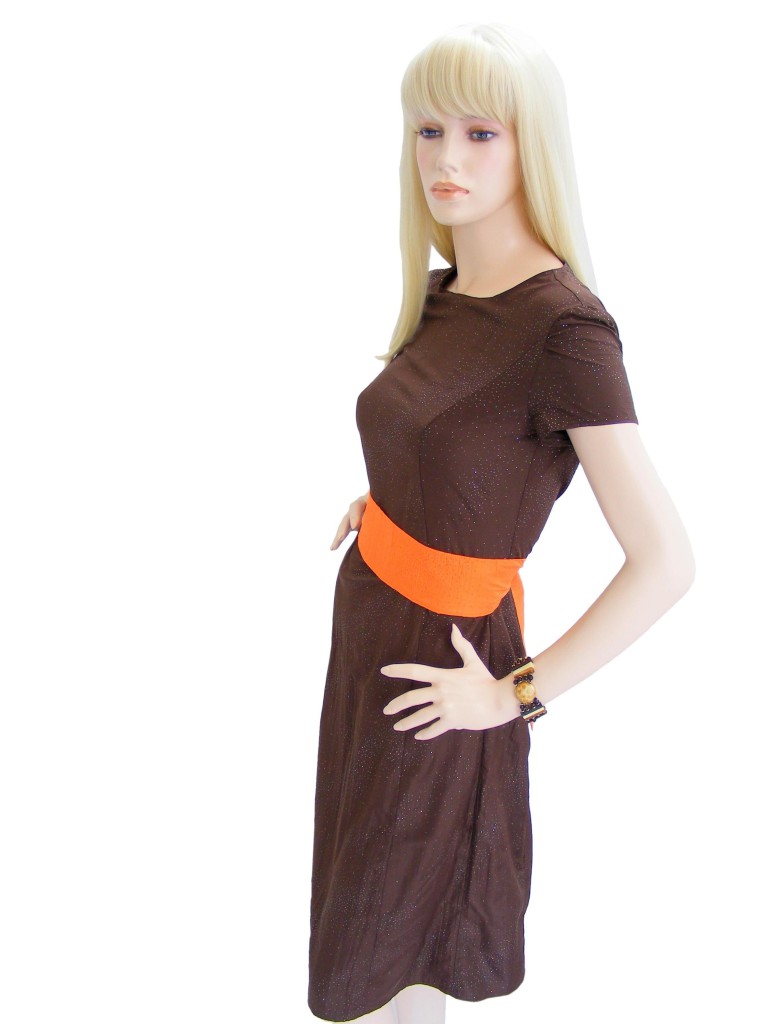2013.016 Hnědé šaty se třpytkami a oranžovým páskem