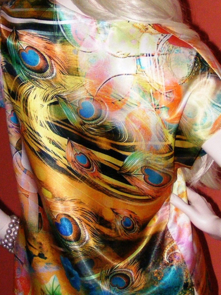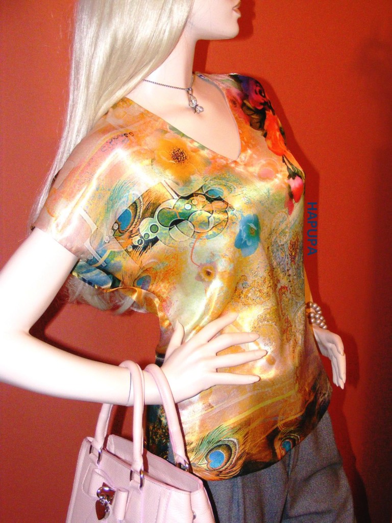 Halenka s výraznými vzory, které spojují florální a geometrické a v zadní části také motivy pavích per. Výstřih do „V“, spadlé krátké rukávy a rozparky na bocích. Satén je příjemným materiálem pro teplé období nebo pokud trávíte velkou část dne v uzavřených prostorách, které někdy působí tísnivě – s chladivým saténem se budete vždy cítit upravená. Výraznější motiv jsem zvolila pro zadní díl. Kombinujte s šedými nebo bílými kalhoty nebo sukní.