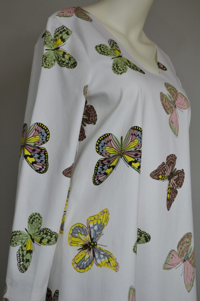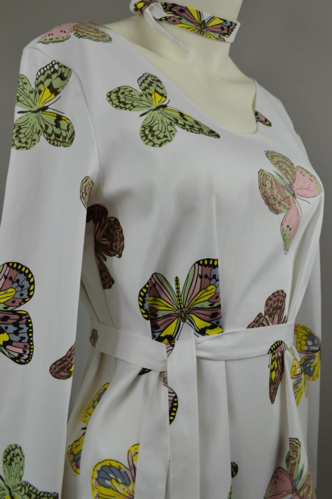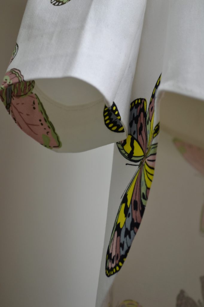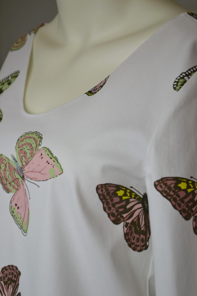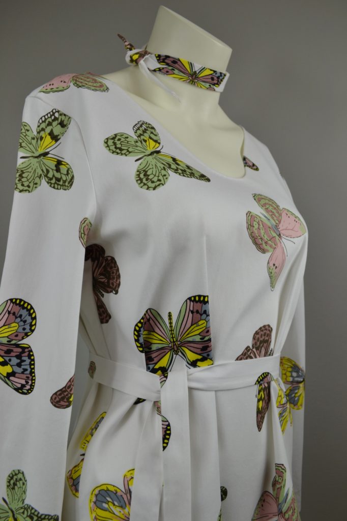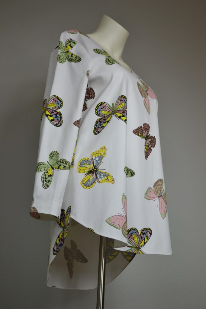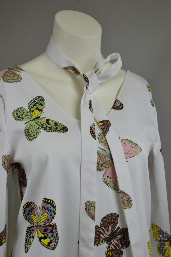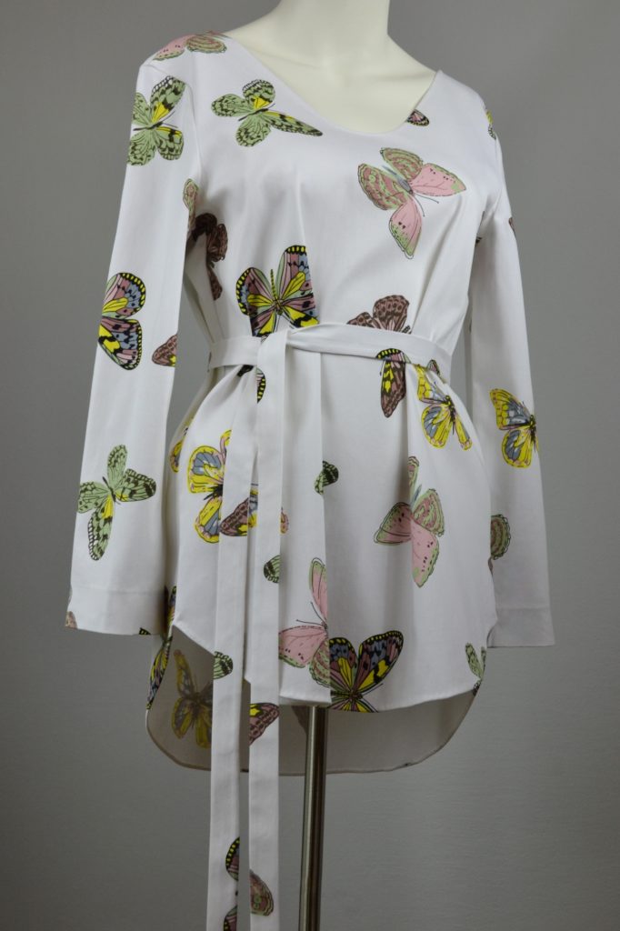 Blůza s motýly na bílém podkladu velmi krásného matného bavlněného saténu. Dlouhý pásek lze omotat kolem zápěstí, uvázat kolem krku, nebo použít jako klasický pásek. Blůzu však můžete vzít zcela bez doplňků a do dekoltu zvolit jemný náhrdelník. Všechny okraje ručně zapravené.